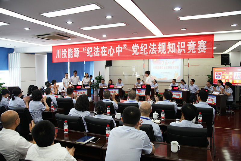 激情七月蓮花香,紀(jì)法銘記享安康。7月25日,由川投能源紀(jì)委主辦、交大光芒黨總支承辦的川投能源“紀(jì)法在心中”黨紀(jì)法規(guī)知識競賽在交大光芒生產(chǎn)基地會議室隆重舉行。集團公司紀(jì)檢監(jiān)察部趙艷到會指導(dǎo),川投能源領(lǐng)導(dǎo)班子成員、所屬企業(yè)黨政一把手、川投能源本部全體黨員和交大光芒部分黨員代表等共計50余人到現(xiàn)場觀看了知識競賽。川能源本部機關(guān)三個支部、所屬企業(yè)天彭電力、交大光芒等五個代表隊參加了紀(jì)法知識競賽。舉辦此次競賽活動,旨在促進全體黨員干部自覺以習(xí)近平新時代中國特色社會主義思想統(tǒng)領(lǐng)企業(yè)改革發(fā)展工作,用中央和省委最新決策部署引領(lǐng)思想行動,用黨紀(jì)條規(guī)規(guī)范廉潔從業(yè)行為,為川投能源健康可持續(xù)發(fā)展提供堅強的政治紀(jì)律保障。