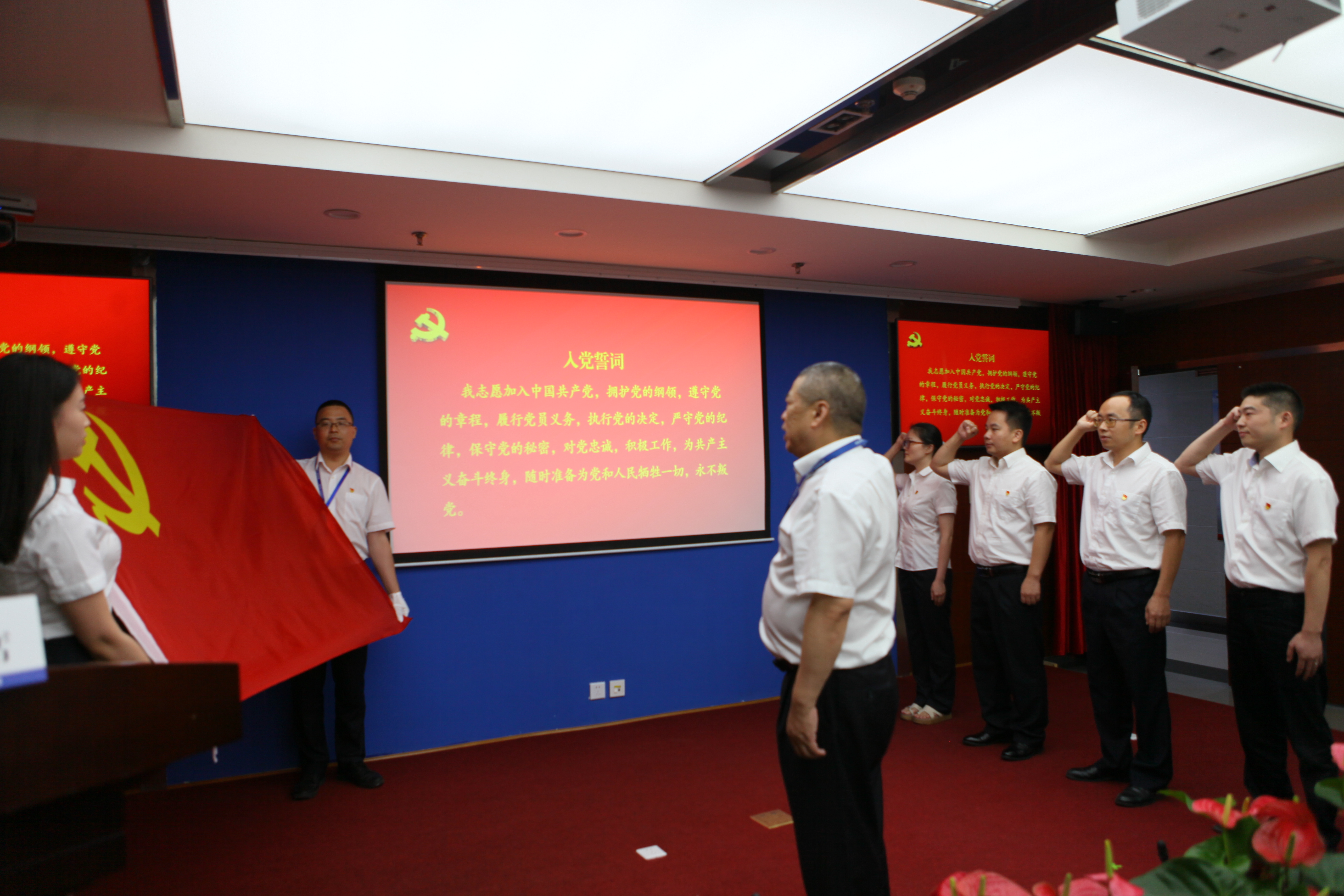 會議在雄壯的國歌中拉開序幕。與會黨員和新黨員代表在公司黨委書記、副董事長、總經(jīng)理?xiàng)詈橥镜膸ьI(lǐng)下,舉起右拳,面向鮮紅的黨旗莊嚴(yán)宣誓。鏗鏘有力的誓言在耳邊久久回蕩,讓新老黨員進(jìn)一步堅(jiān)定了入黨信念,增強(qiáng)了黨性意識,鞭策和激勵(lì)著大家履職盡責(zé)、干事創(chuàng)業(yè),以新氣象、新作為兌現(xiàn)對黨的莊嚴(yán)承諾。