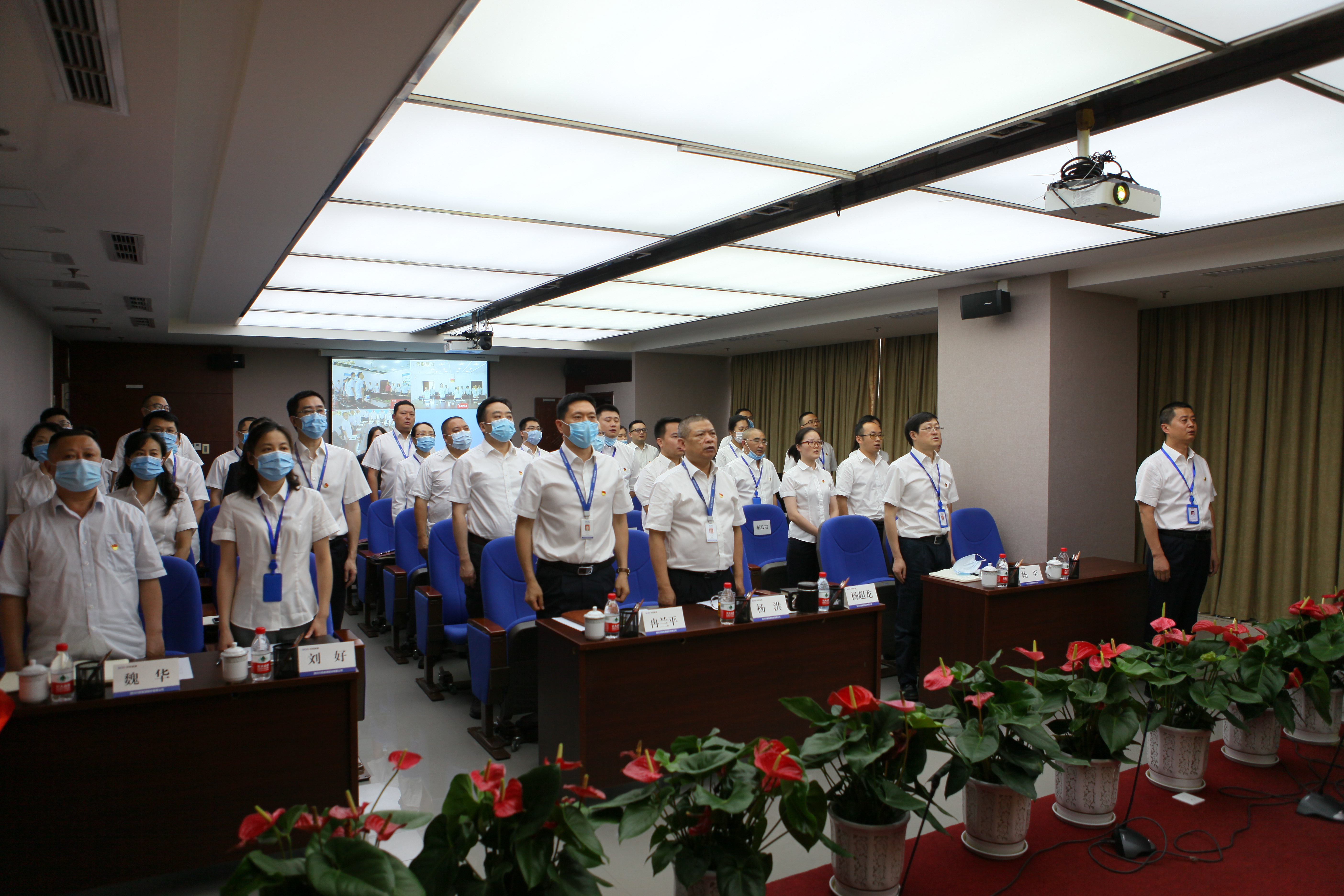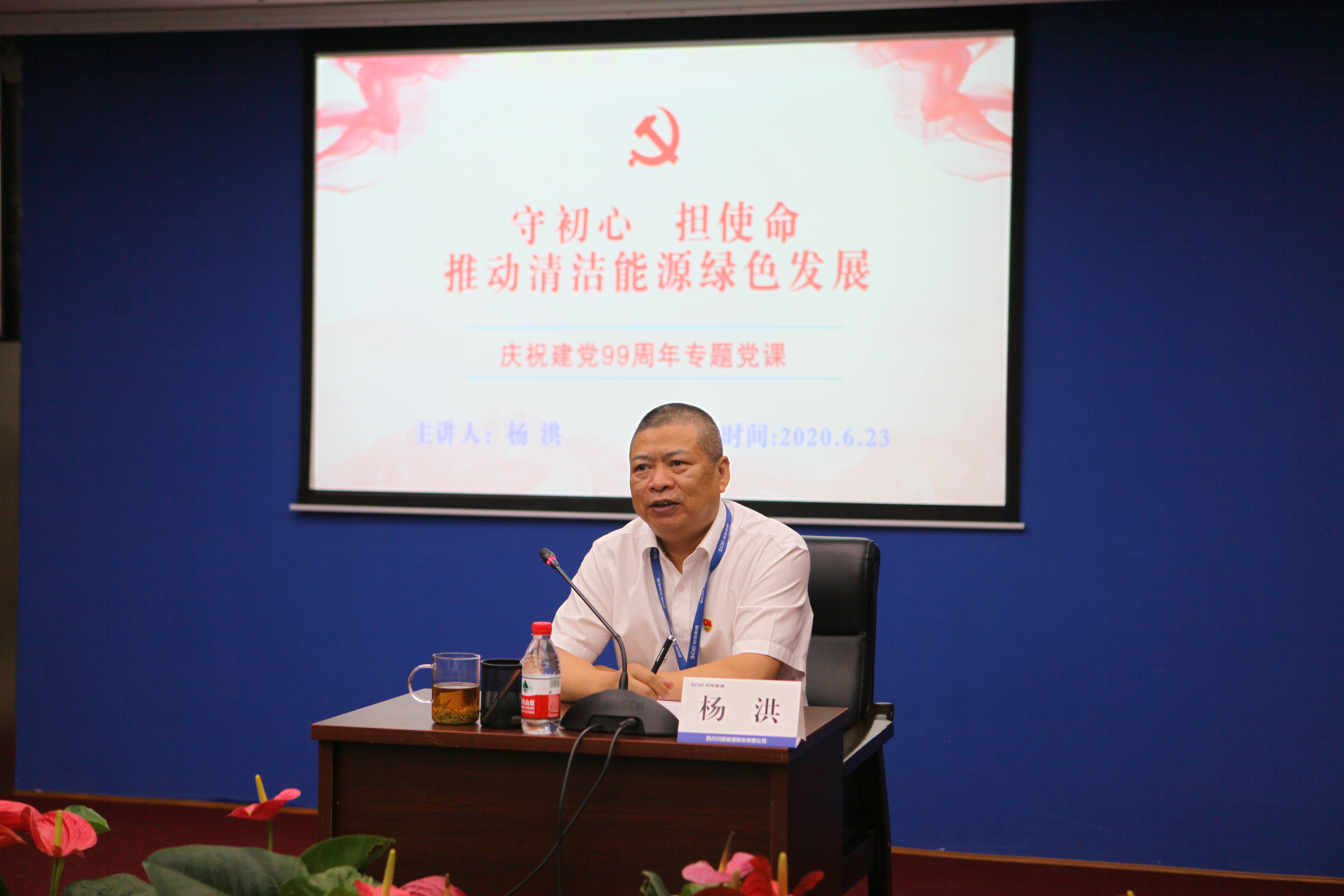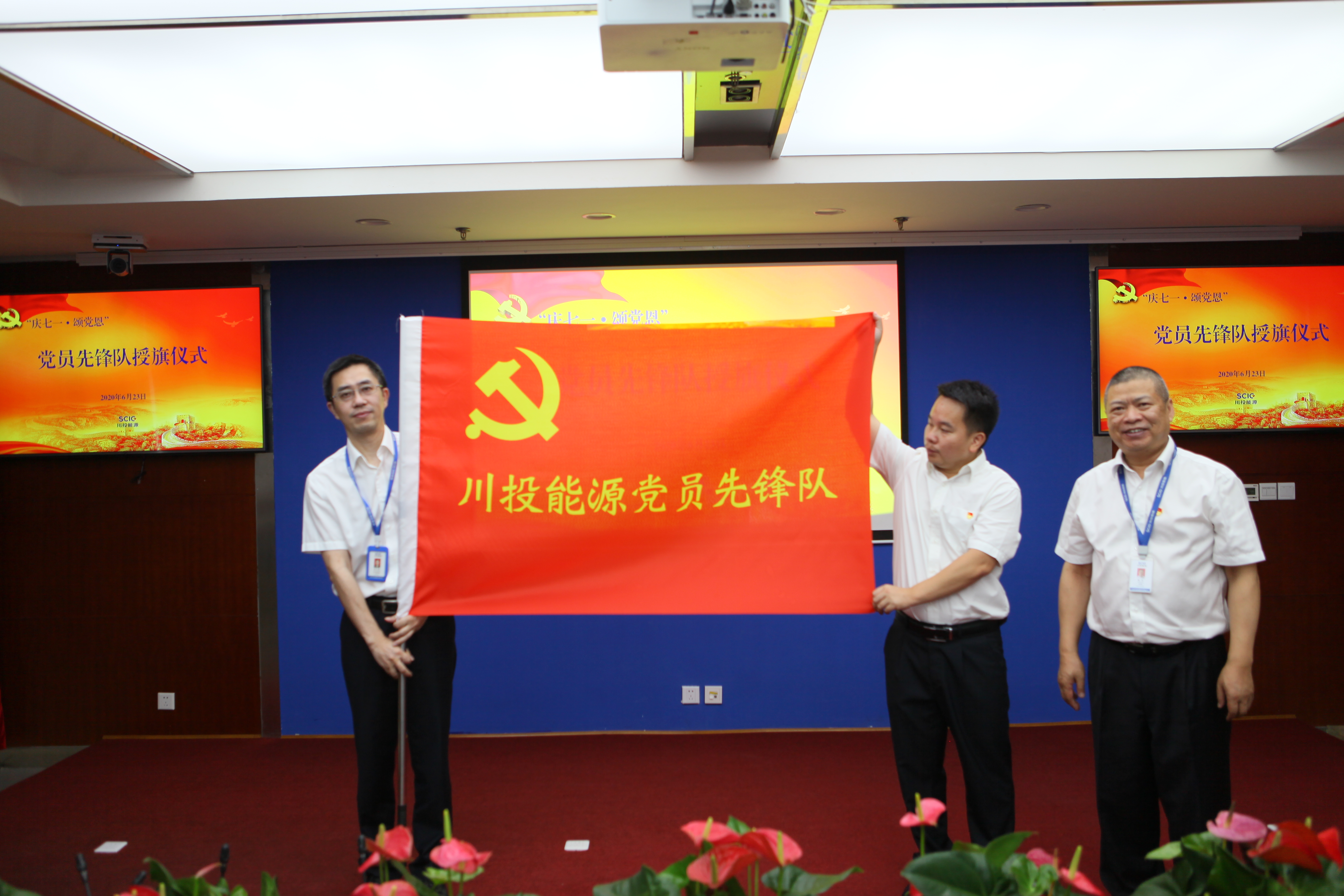 值此川投能源“紅色引擎藍(lán)籌先鋒”(簡稱“五個(gè)先鋒”)黨建品牌創(chuàng)建工作引向深入之際,6月23日,川投能源黨委采用現(xiàn)場和視頻會議相結(jié)合的方式,以黨員承諾踐諾、黨員先鋒隊(duì)授旗、發(fā)布公司黨建品牌標(biāo)識以及公司黨委書記講黨課等內(nèi)容為載體,組織全體黨員、入黨積極份子、新黨員代表隆重召開紀(jì)念建黨九十九周年大會,為中國共產(chǎn)黨第99個(gè)生日獻(xiàn)上賀禮。公司黨委副書記、工會主席楊超龍主持會議。
