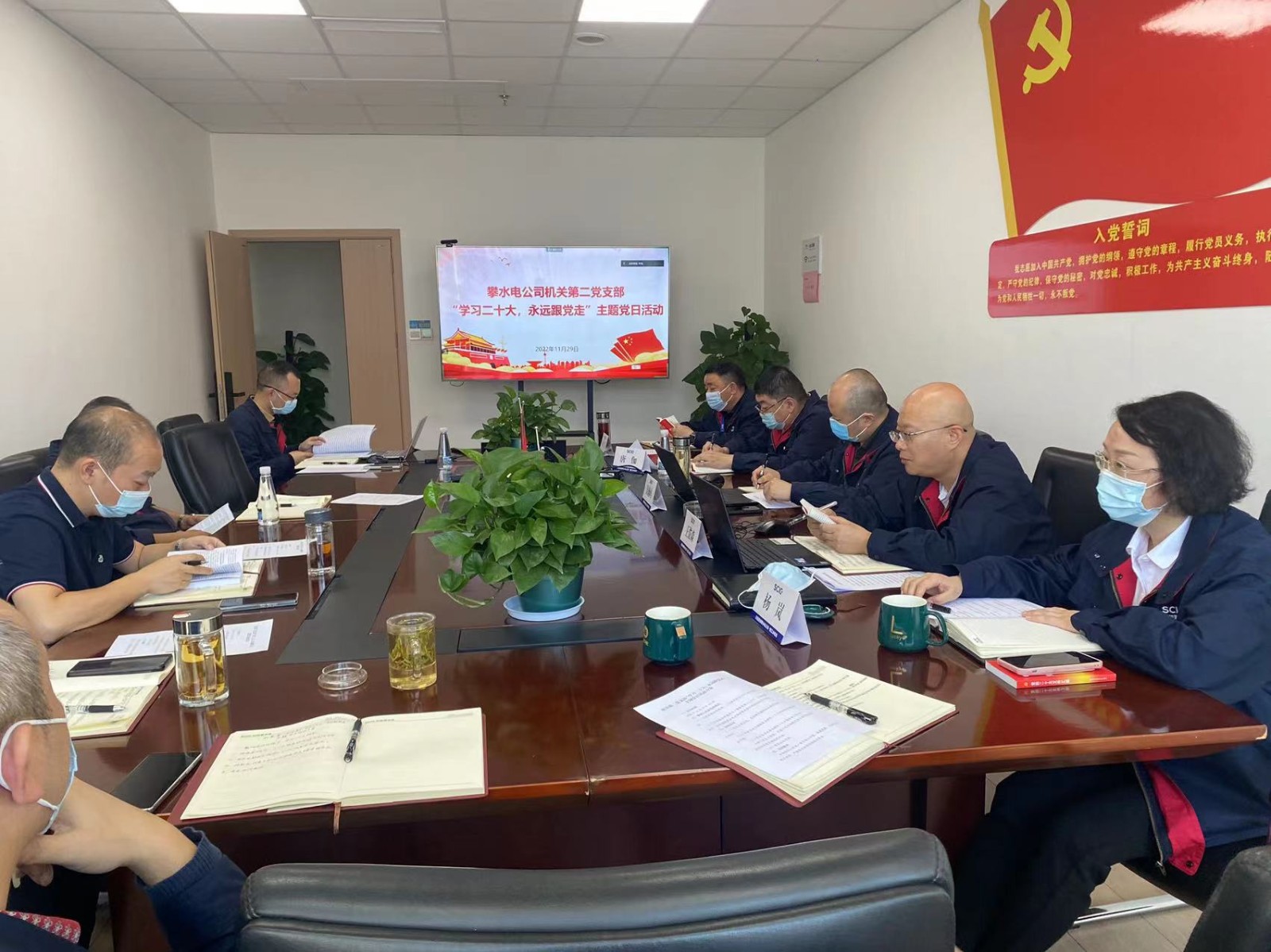 旗幟指引方向,信心凝聚力量。11月29日,攀水電公司機關(guān)第二黨支部采取線上與線下相結(jié)合的方式組織開展“學習二十大,永遠跟黨走”主題黨日活動,所屬黨員、非黨中干及入黨積極分子20人參加活動,黨總支副書記、總經(jīng)理吳巍嶼等5名領(lǐng)導班子成員、黨總支委員落實“雙重組織生活”要求,以普通黨員身份參加活動。