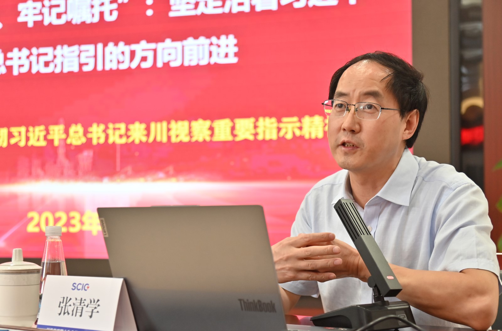 張清學結(jié)合習近平總書記三次來川視察,從11個方面深入淺出詳細講授了習近平總書記來川視察的重要指示精神,結(jié)合時政熱點,善用黨史故事,圍繞聚焦重點再發(fā)力,緊盯生態(tài)環(huán)境保護、科技創(chuàng)新和高校畢業(yè)生就業(yè)、安全生產(chǎn)、地質(zhì)災(zāi)害防治等重點工作進行講述。