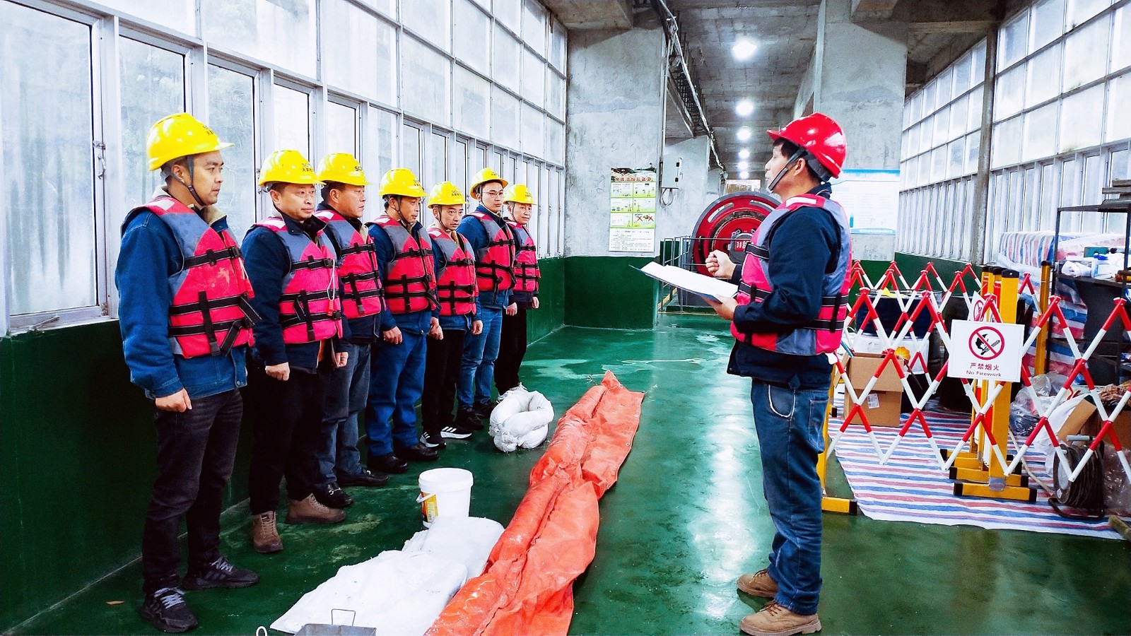 演練以局部湖面水質污染為背景,采用現場模擬形式進行。上午9:30分,鳳鳴湖大壩1#、2#、3#弧形閘門全關,進水閘門全開,大壩引水隧道正常通水,鳳鳴橋站單機運行,當值運行人員巡視檢查中發(fā)現庫區(qū)湖面局部污染,按公司《突發(fā)環(huán)境事件應急預案》,“險情”于第一時間傳達至當值班長、車間主任和公司應急領導小組,同時車間迅速啟動防水環(huán)境污染事件應急預案,各項應急處置流程迅即有序進行,沙金車間封堵控制滲漏源,鳳鳴橋車間立即停機關閉蝶閥,搶險人員緊急使用攔油索、吸油棉及工器具阻擊水面油污擴散,經過各方爭分奪秒通力配合,湖面滲漏油全部打撈處置完畢,成功處置了這起“突發(fā)水環(huán)境污染事件”。