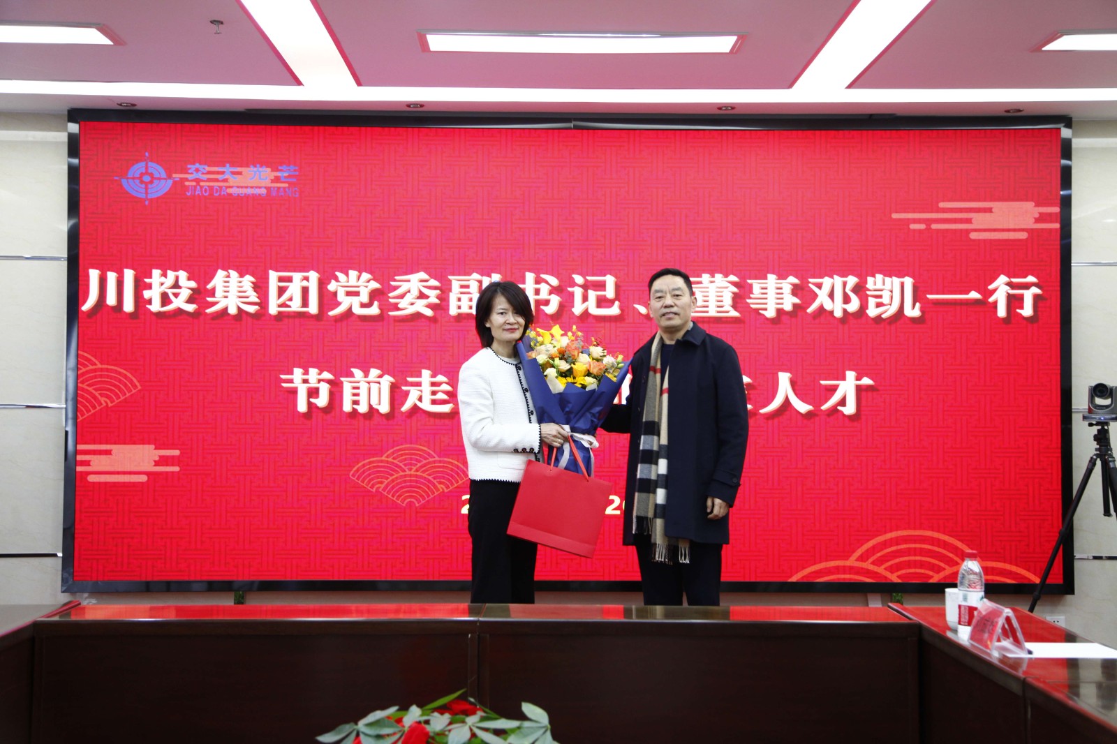 1月26日,川投集團(tuán)黨委副書記、董事鄧凱帶隊(duì)赴交大光芒走訪慰問專家人才。川投集團(tuán)機(jī)關(guān)黨委書記、黨委組織部部長朱莉,黨委宣傳部(群團(tuán)工作部)部長何金輝參加走訪慰問。川投能源黨委委員、財(cái)務(wù)總監(jiān)兼交大光芒董事長劉好一同參加走訪慰問。