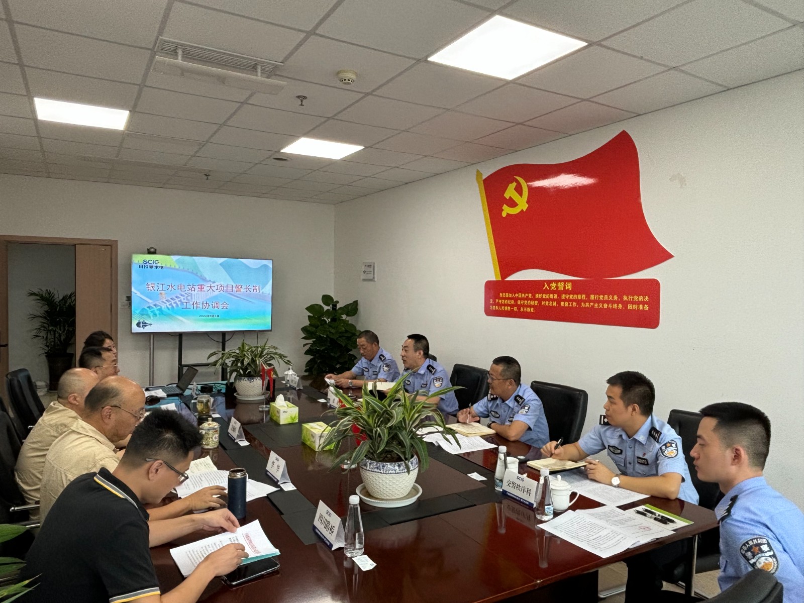 為保障銀江水電站重大項目安全順利推進,護航服務攀枝花市高質量發(fā)展建設共同富裕試驗區(qū),攀枝花市公安局與攀水電公司建立了銀江水電站“重大項目警長制”,9月3日上午,市公安局機關黨委副書記張征帶隊赴公司召開工作協(xié)調會議。攀水電公司黨總支副書記、總經(jīng)理、聯(lián)絡工作組組長吳巍嶼出席會議,交警支隊辦公室、秩序科、三大隊及公司相關部門等10余人參加會議。