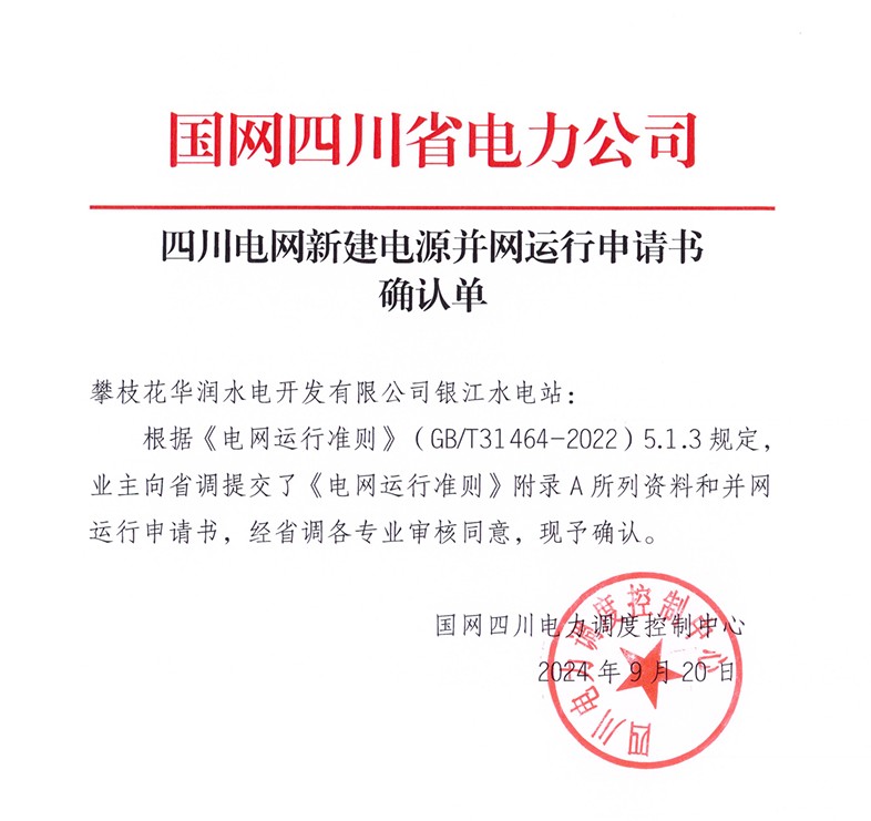 9月20日,在國網(wǎng)四川省電力公司和川投能源的指導(dǎo)幫助下,經(jīng)過積極對接、多方協(xié)調(diào),攀水電公司成功取得銀江水電站新建電源并網(wǎng)運(yùn)行申請書確認(rèn)單,標(biāo)志著銀江水電站具備并網(wǎng)手續(xù)辦理的資格條件。