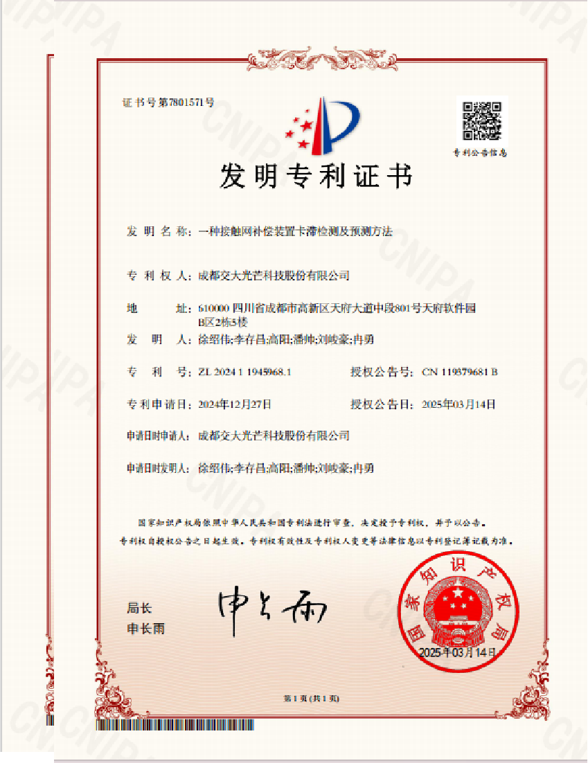 近日,川投能源所屬交大光芒公司“接觸網(wǎng)補償裝置卡滯檢測及預測方法”和“基于多維數(shù)據(jù)的列車融合定位方法”兩項創(chuàng)新技術獲得國家知識產(chǎn)權局發(fā)明專利授權。截至目前,交大光芒鐵路接觸網(wǎng)檢測監(jiān)測智能化相關創(chuàng)新技術累計獲得發(fā)明專利授權達到9項,另有多項創(chuàng)新技術已申請發(fā)明專利并獲受理。