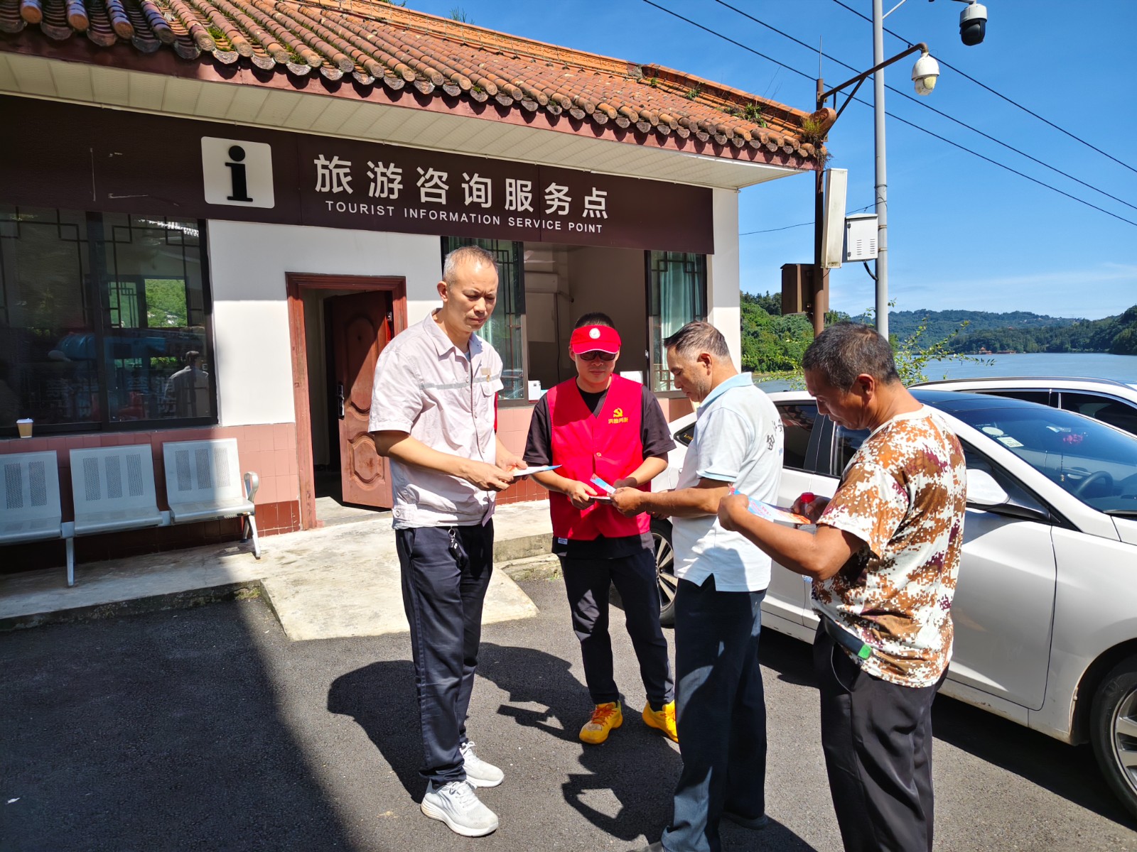 活動現(xiàn)場,志愿者耐心地為游客提供景區(qū)景點、游覽路線、交通信息等咨詢服務,幫助游客規(guī)劃合理的游覽行程,確保游客能夠順利、愉快地游覽景區(qū)。在景區(qū)停車場區(qū)域,協(xié)助景區(qū)工作人員維持交通秩序,引導游客有序停車,保障了停車場的暢通和游客的安全。黨員志愿者們還積極開展《中華人民共和國反有組織犯罪法》宣傳活動。向他們發(fā)放宣傳手冊,提高游客對有組織犯罪的認識和防范意識,引導廣大游客自覺遵守法律法規(guī),共同維護社會和諧穩(wěn)定。